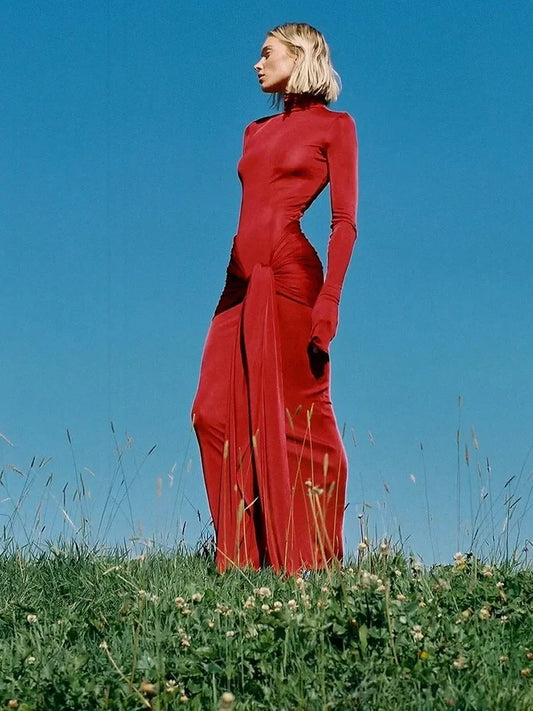 High Neck Long Sleeve Bodycon Dress Women's Tight Elastic Lace Up Maxi Long Dress Autumn 2023 New Party Club Vestidos