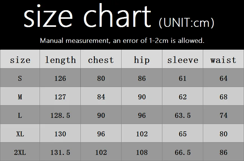 size_info: {"sizeInfoList":[{"length":{"cm":"126","inch":"49.61"},"size":"S","vid":-36},{"length":{"cm":"127","inch":"50.00"},"size":"M","vid":-37},{"length":{"cm":"128.5","inch":"50.59"},"size":"L","vid":-38},{"length":{"cm":"130","inch":"51.18"},"size":"XL","vid":-39},{"length":{"cm":"131.5","inch":"51.77"},"size":"XXL","vid":-40}]}