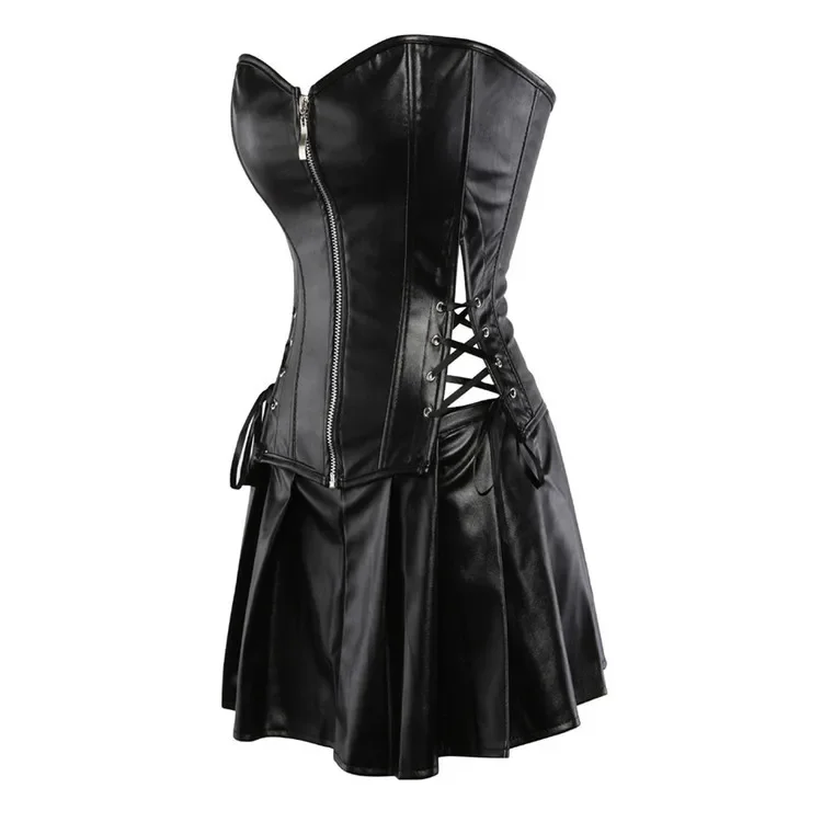 Leather Corset Dress Lace up Zipper Sexy Women Bustier Top with Mini Skirt Set Overbust Burlesque Costumes Body Shaper Plus Size