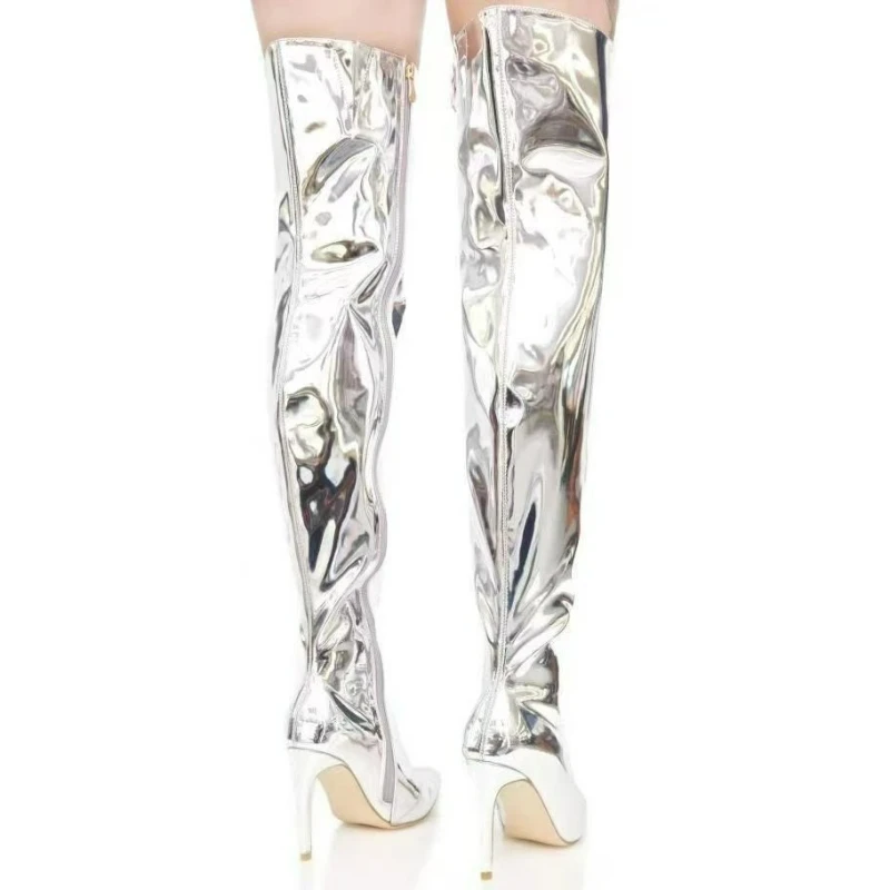 Women Sexy Silver Mirror Thigh High Boots T Show Pointy Toe Club Party Shoes Thin High Heels Over The Knee Long Boots For Women